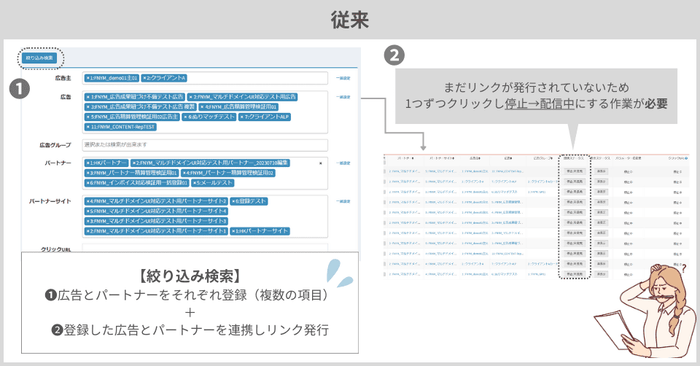 時間短縮:広告に対して数百本のパートナーサイトを紐づける場合、提携作業時間がおよそ10分の1になります。