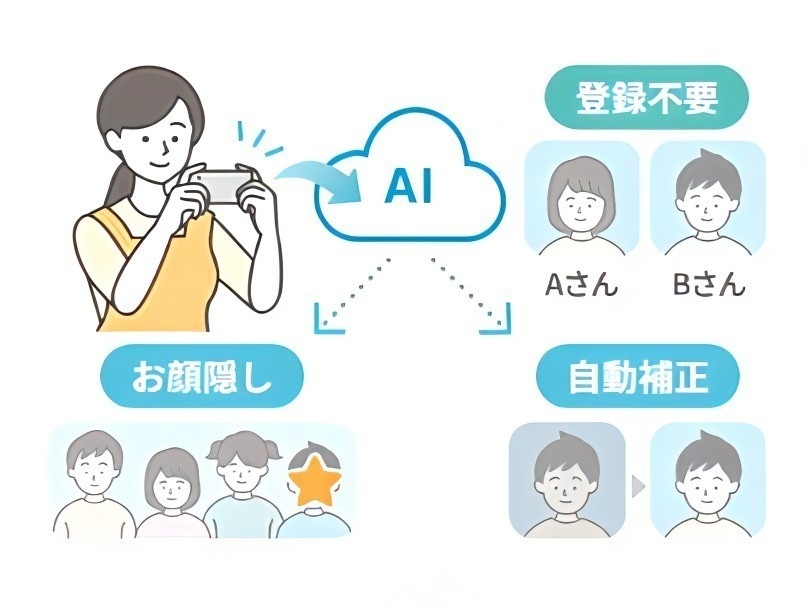 グループ会社の(株)とりんく独自のAI技術により、子どもの顔を正確に認識し、写真業務をサポートする便利な機能を多数搭載しています。