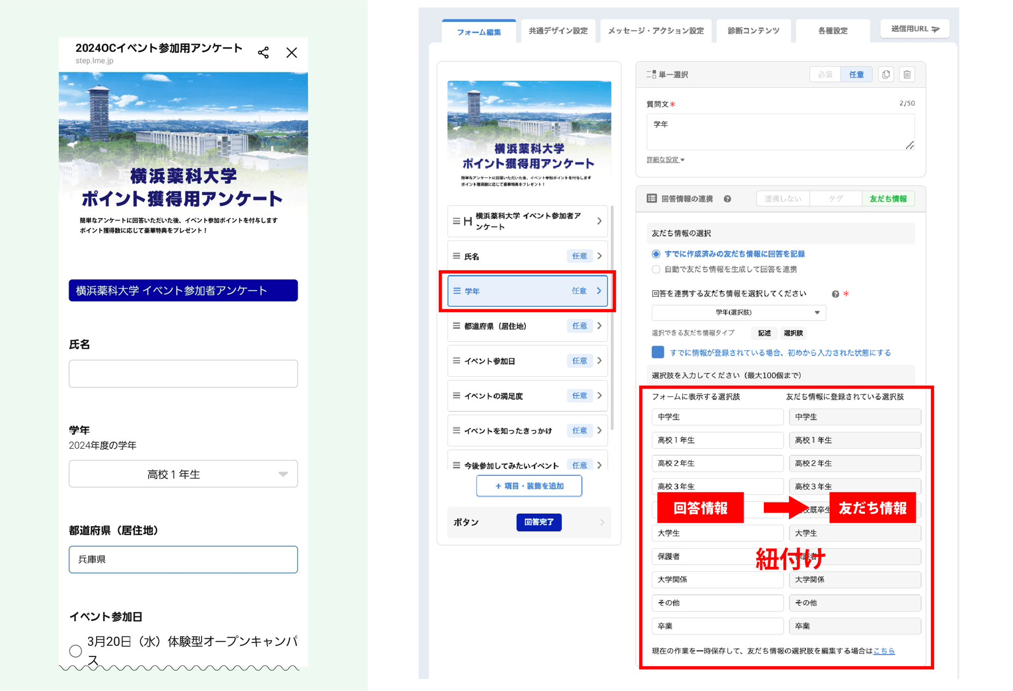 L Messageのフォーム作成機能を活用し、イベント参加者の「学年」「居住地」「参加日時」などをLINE上でスムーズに収集。