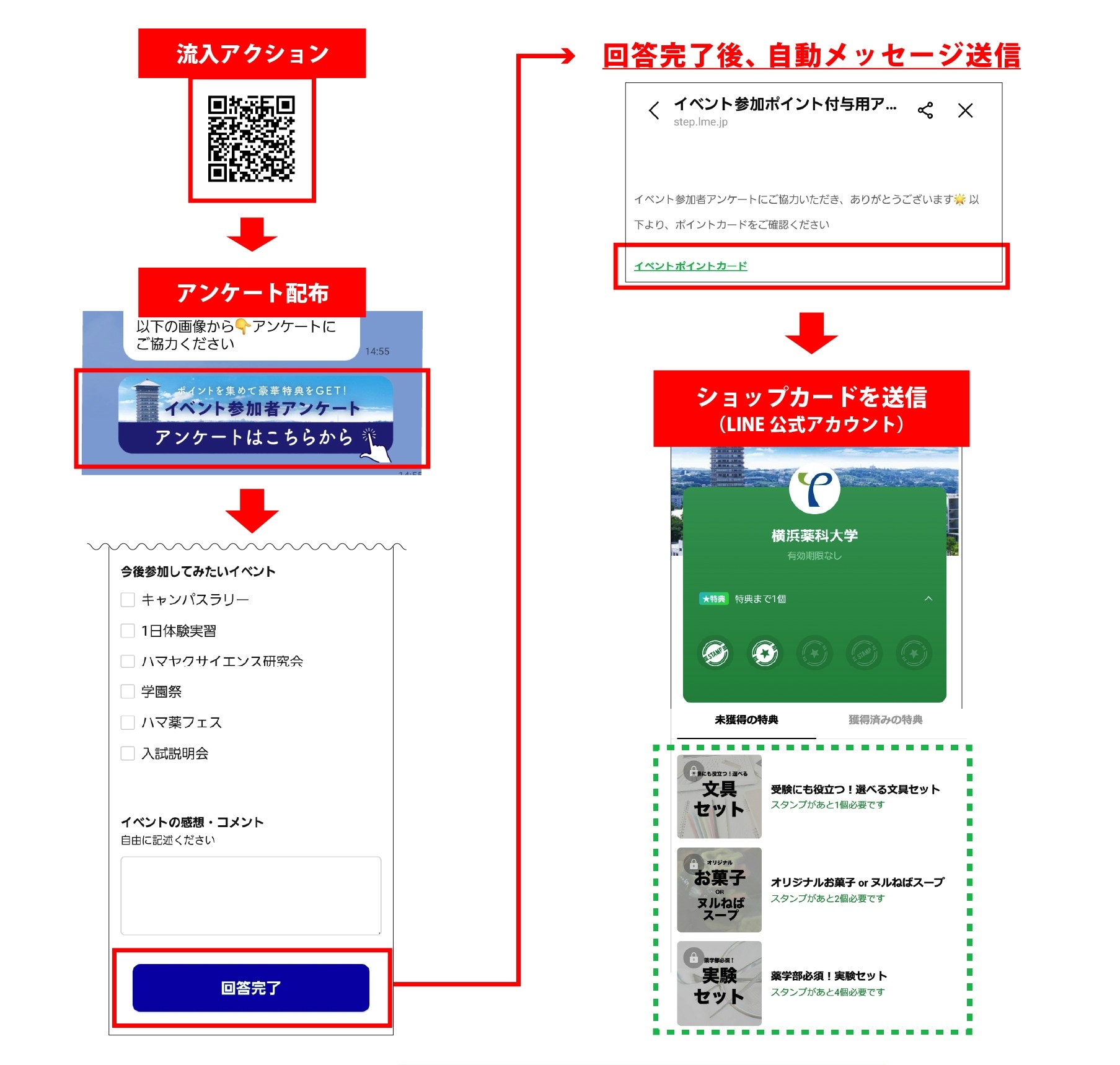 ・イベント専用QRを読み取り → 自動でアンケート配布&ショップカード送信