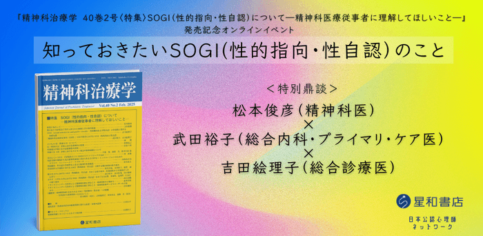 【今夜開催】オンラインセミナー『知っておきたいSOGI(性的指向・性自認)のこと「精神科治療学 40巻2号〈特集〉SOGI(性的指向・性自認)について―精神科医療従事者に理解してほしいこと―」発売記念オンラインイベント』を開催します