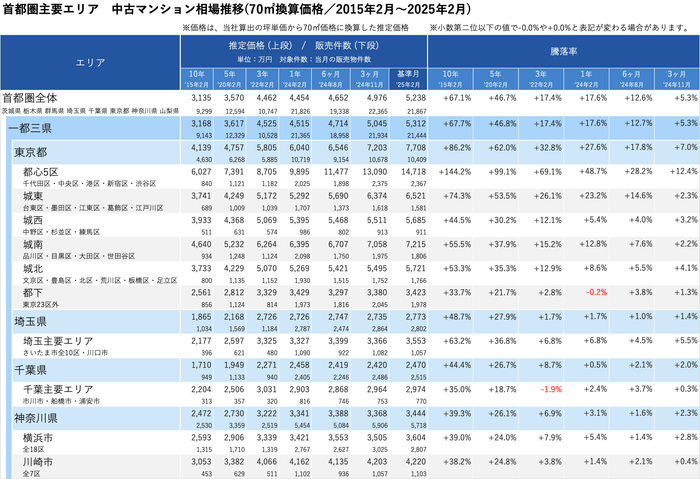 「不動産×WEB×ビッグデータ」の領域で、さまざまな不動産テックサービスを展開する株式会社ワンノブアカインド(本社:東京都港区、代表取締役社長:川島 直也、以下当社)は、当社が運営しているマンション情報サイト「マンションレビュー」の保有データを元に、全国の2025年2月の中古マンション相場を調査。坪単価をベースに70㎡での価格に換算した「中古マンション価格」*1について、10年前・5年前・3年前・前年からの推移を都道府県別・エリアごとにまとめましたので、発表いたします。
