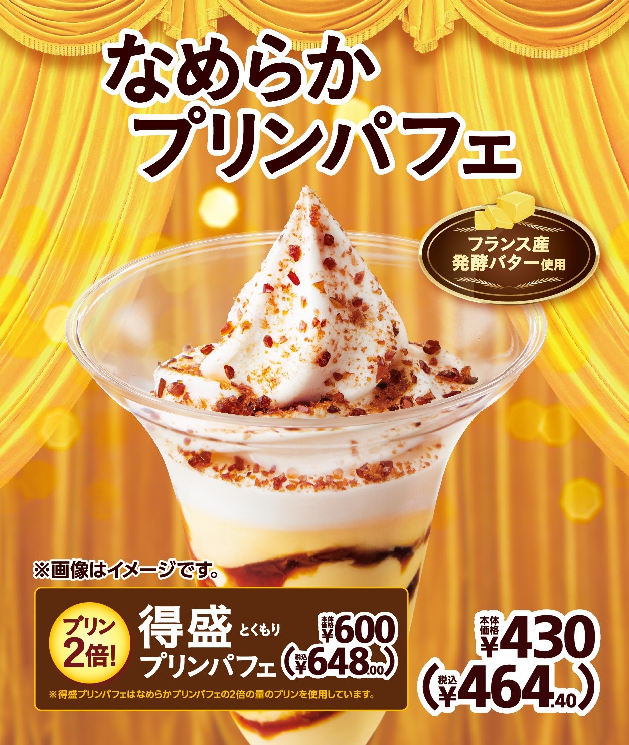 ●商品特長:「なめらかプリンパフェ」を秋・冬向けにリニューアル。芳醇な香りが広がるフランス産発酵バターと、コク深く雑味のないエグロワイヤルの卵を使用。