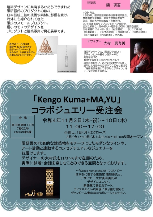建築デザインに共鳴するかたちでうまれた隈研吾氏のプロダクトの数々。日本伝統工芸の技術や素材に影響を受け、海外にも紹介されてきた隈氏のスモールプロダクト、極小のモノのデザインをプロダクトと建築写真で見る展示です。建築よりももっと身近な形で隈氏のデザインに親しむことができます。展覧会期中、「スケスケ」「マゲマゲ」も展示いたします。
