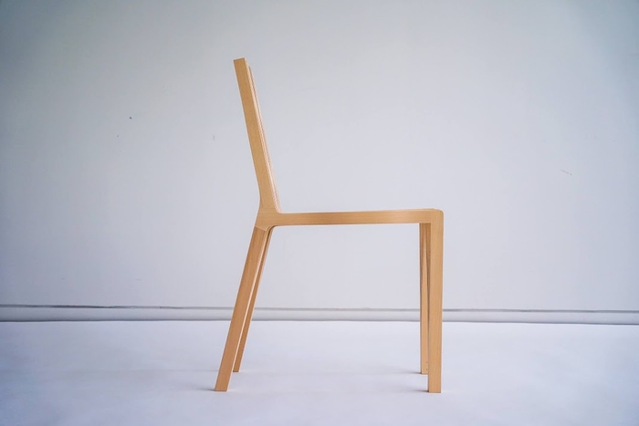 成形合板という技法でブナ材1.5㎜を2層にした3㎜の座と背の部材と1.5㎜を4層にした6㎜の脚の部材を相欠きと竹釘とボンドの接着のみの構造で成り立たせています。