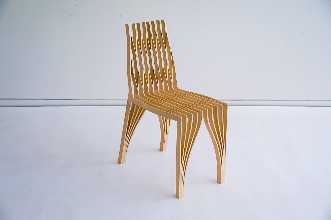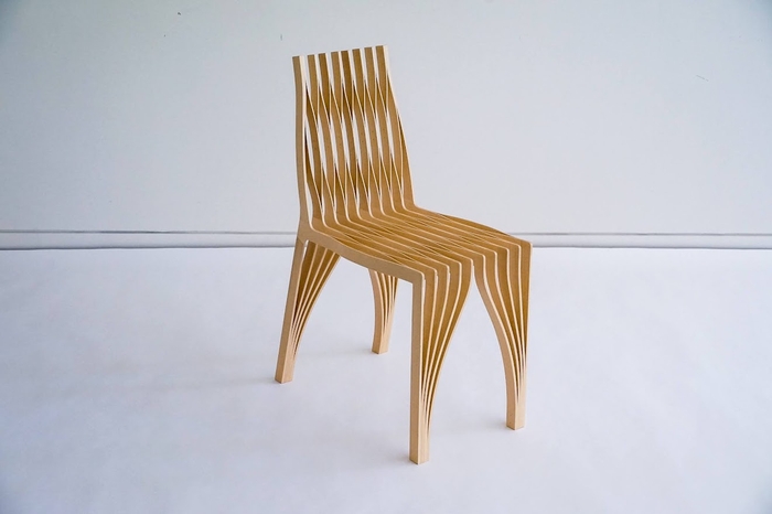 一般的な建築資材である合板を曲げ加工して作り上げた、やわらかい椅子