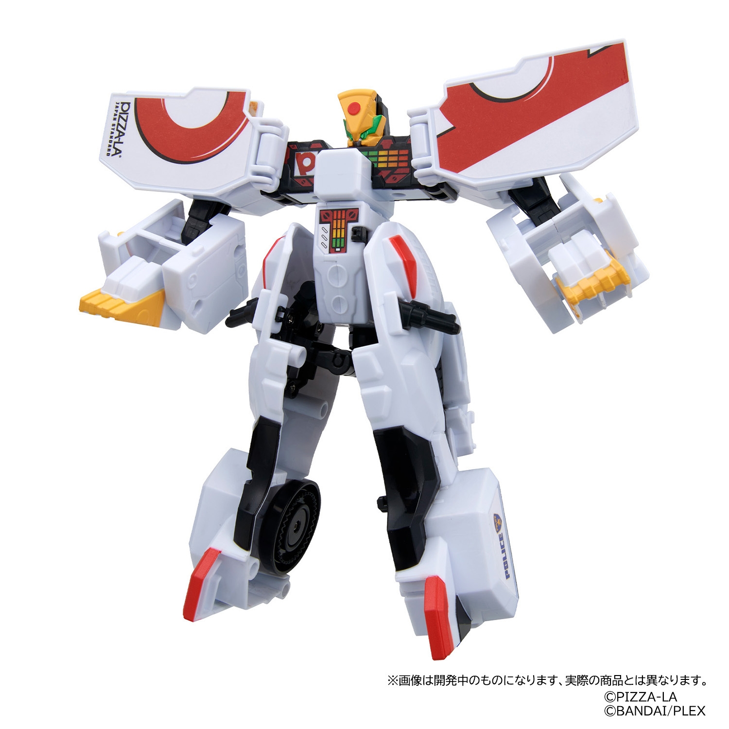 ピザーラの「ピザ」と「白バイ」が合体・変形して二足歩行型のロボが完成します。