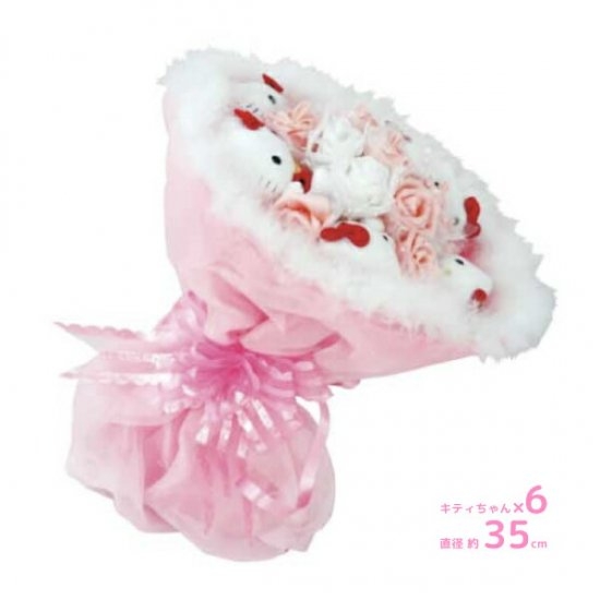 こちらは一番大きなサイズで、キティちゃんの小さなぬいぐるみがなんと40体もついています。それだけでも可愛いのに、白とピンクのバラの造花がさらに可愛さをアップしてくれています。