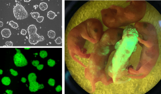 ※13 キメラマウス:異なる遺伝的背景を持つ細胞を組み合わせて作られるマウス個体。研究では主に遺伝子操作された多能性幹細胞をマウス初期胚に注入もしくは凝集培養してキメラ胚を作り、仮親の子宮に移植することでキメラ個体を作製し、遺伝子の機能や疾患の研究に利用される。