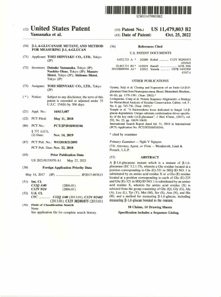 本特許は、東京薬科大学薬学部免疫学教室と共同で行った、当社の露地栽培アガリクスKA21株に関する共同研究の中から発案された技術です。日本国内では2022年4月4日に特許登録されており(特許第7052967号)、今回2022年10月25日にアメリカでも特許登録されました(US11,479,803 B2)。関連する技術として、2021年10月26日に登録された特許「β-グルカン結合タンパク質、β-グルカン検出キット、人工DNAおよび細菌(特許第6966756号)」、2020年9月7日に特許出願した「β-1,6-分岐β-1,3-グルカンまたはβ-1,3-グルカンの検出・定量方法および検出・定量キット(特願2020-149797)」があります。(どちらも特許権者は当社 東栄新薬株式会社)