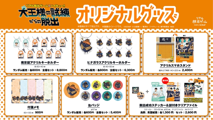 └内容物:脱出成功ステッカー(円形)直径55mm、ビジュアルステッカー(四角)50×50mm、謎付きクリアファイル烏野A4サイズ、謎付きクリアファイル青葉城西A4サイズ、メインビジュアルクリアファイルA4サイズ、メインビジュアルポストカード