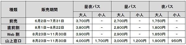 【料金】上記、夜パスまたは昼夜パスのとおり
