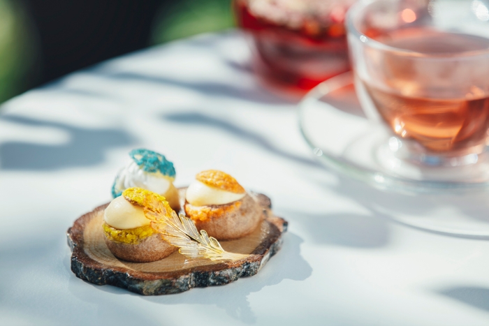 新緑の森をひとり占めできる場所で探鳥後のひとときを用意します。そこは、普段は立ち入ることができず、日常的な音の聞こえない木々に囲まれた場所です。森に生息する動物の息吹が感じられ、さまざまな野鳥の美しいさえずりが響きます。その場所に1組限定の貸し切り席を用意し、野鳥をモチーフにした小菓子と、野鳥が種子を運ぶことで育つヤマモモやアケビなど、木の実を使ったホットドリンクを提供します。探鳥の最後まで、野鳥のさえずりを聞いて癒されることができます。