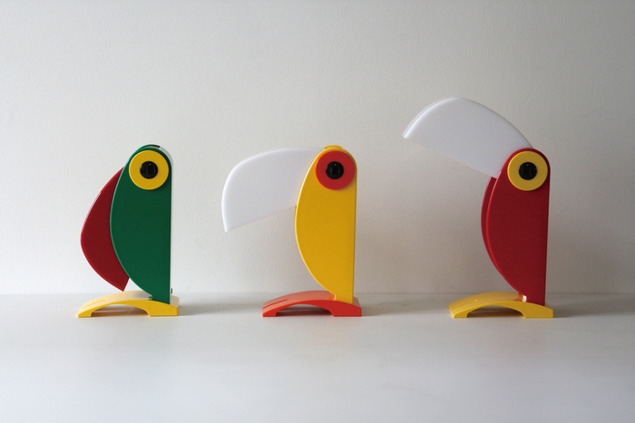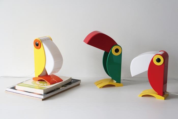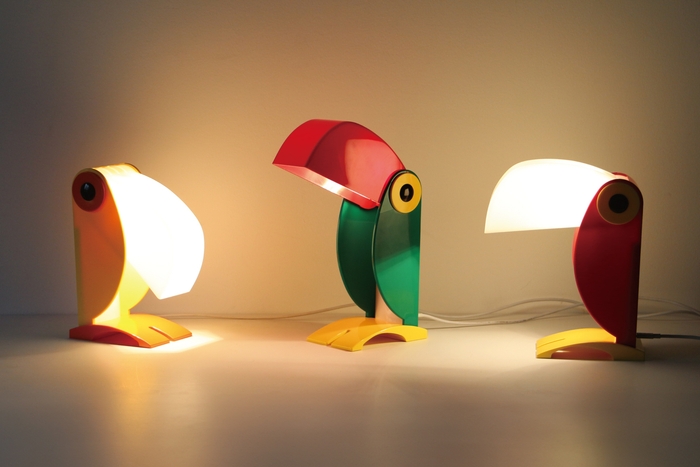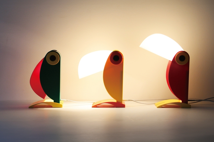 南米に生息するオオハシの優美でダイナミックな姿をモチーフにしたこのランプは、1970年に当時革新的だったポリプロピレン「モプレン」を使い誕生しました。優れた強度を持つプラスチックを使用した世界初の子供向けランプで、絶妙なバランスで調和する曲線美と幾何学的なシルエット、キャラクターを連想させるアイコニックなデザインは世界中で注目され人気を博しました。このランプは時代を超えて愛され、当時のヴィンテージ品は今でもミッドセンチュリーコレクターの間で取引されています。