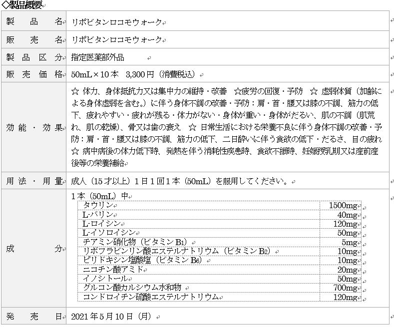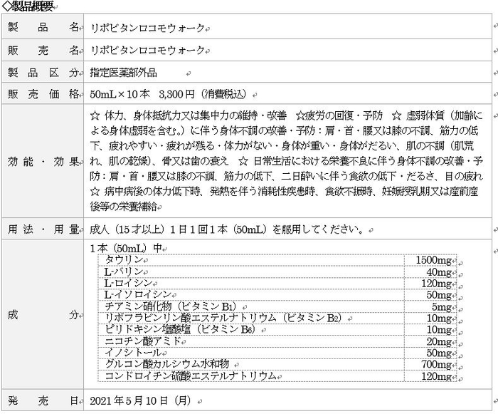 大正製薬株式会社[本社:東京都豊島区 社長:上原 茂](以下、当社)は、リポビタンシリーズから、疲労回復だけでなく、加齢に伴う膝や腰の不調を改善する指定医薬部外品ミニドリンク剤「リポビタンロコモウォーク」を5月10日(月)より当社通販サイトの大正製薬ダイレクトで販売開始いたします。