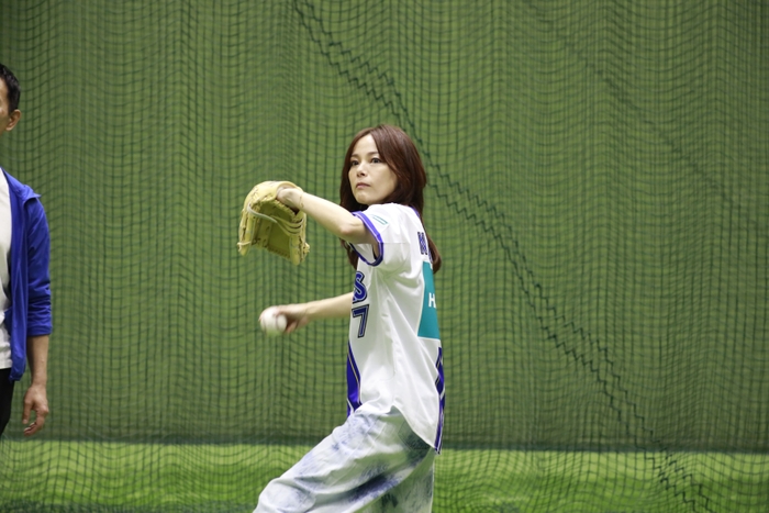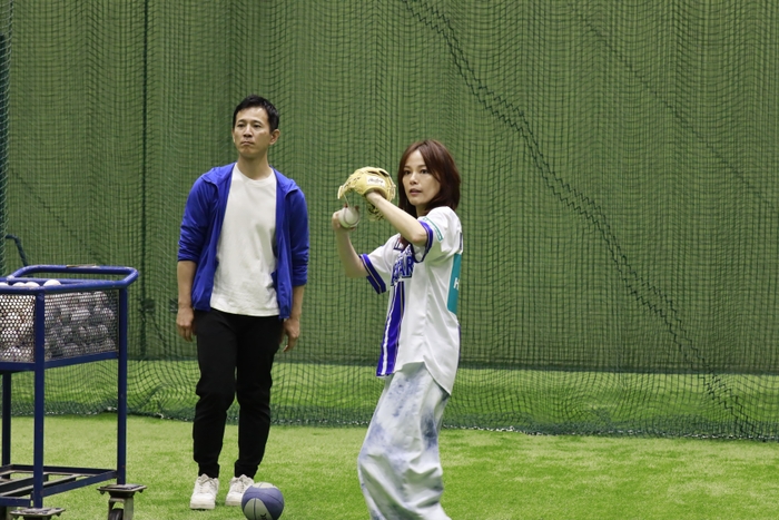 Hisenseロゴとご自身の名前がプリントされた特別ユニフォームを着用して室内練習場にやってきた相川さんは、投球練習に向けて入念に肩と腕のストレッチを行ない、「よし!行きましょう!」と気合い十分の様子。早速、始球式前の最終調整のためピッチングを始めると、一球目から勢いのあるボールを投げ、始球式に向けて上々な仕上がりを披露しました。上の方を目がけて投げることや肩の使い方のアドバイスをもらいながら、1球1球丁寧に投球を重ね、ついにノーバウンドでキャッチャーまで届くと、笑顔を見せる場面も。投球練習後には、キャッチャーからこれまでで一番いいボールが来ていたと声をかけられるなど、本番でノーバウンドピッチングを果たすべく、万全な準備を行なっていました。