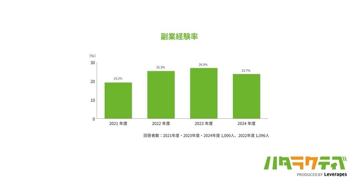 過去4年間の推移を比較すると、2021年度から増加傾向にあった一方で、2024年度の副業経験率は23.7%と、前年度より微減しました。過去4年間の副業経験率は、増加傾向が鈍化した一方で20%前後で推移しており、副業経験のある正社員は一定数いることが分かります。
