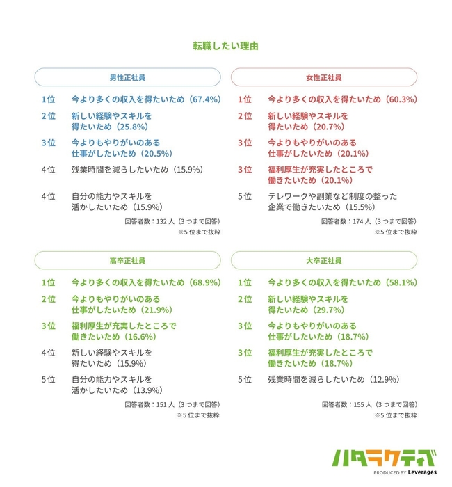 学歴別に見ると、高卒正社員の転職したい理由の2位は「今よりもやりがいのある仕事がしたいため(21.9%)」ですが、大卒正社員の2位は「新しい経験やスキルを得たいため(29.7%)」でした。高卒正社員はやりがいを、大卒正社員は新しい経験やスキルを求めて転職を検討する傾向が見受けられます。