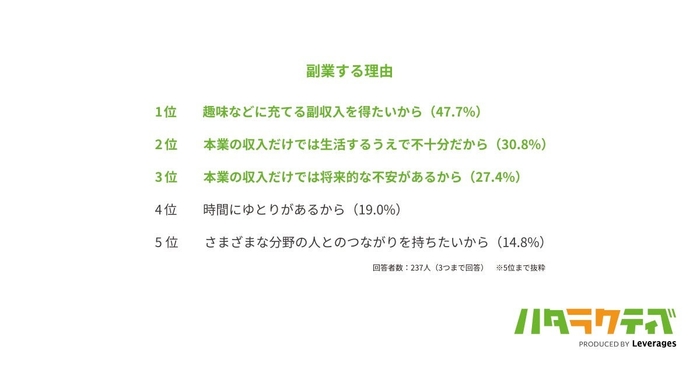 1位の「趣味などに充てる副収入を得たいから(47.7%)」と2位の「本業の収入だけでは生活するうえで不十分だから(30.8%)」では約1.6倍の差があり、生活に困っているから副業をするよりも、より自分の生活を豊かにするために副業をしている人が多く見受けられます。
