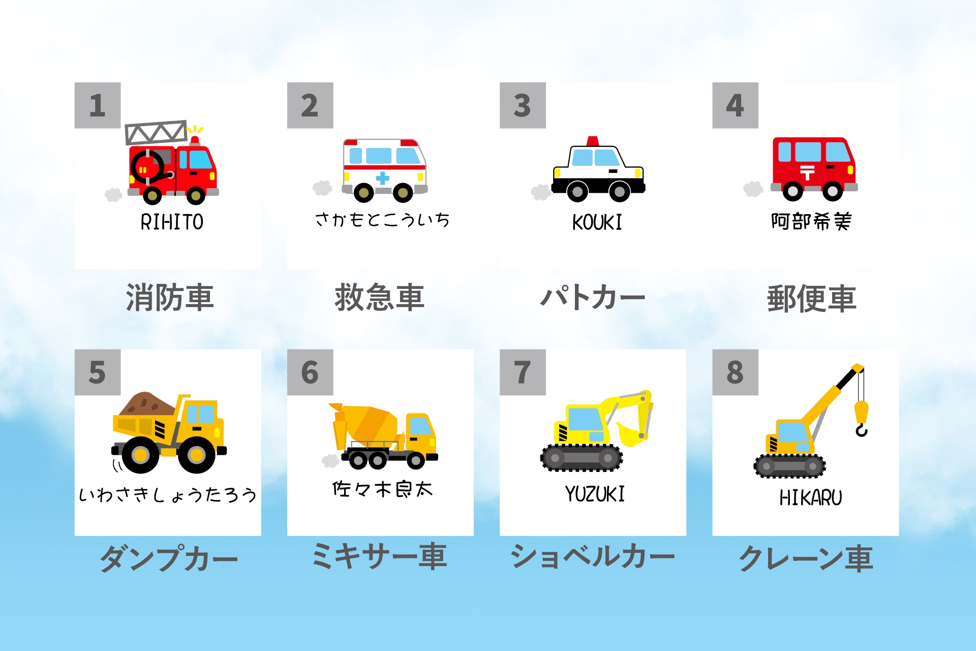 このデザインは、子どもたちに人気の「はたらくくるま」をモチーフにしたアイテムです。消防車や救急車、パトカーなどの定番車両から、ダンプカー、ショベルカー、クレーン車といった工事車両まで、全8種類のデザインが揃っています。