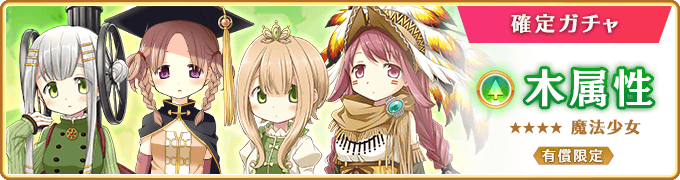 本ガチャでは、魔法少女の登場時に木属性の魔法少女が確定で登場いたします。