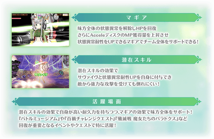 スキルで「毒」や「幻惑」といった状態異常を付与してくるため、敵のスキルを妨害する「スキル不可」や、付与された状態異常を解除、もしくは状態異常耐性をUPし状態異常を防ぐコネクトやマギアを持った木属性の魔法少女を編成、またはメモリアを装備することが有効です。