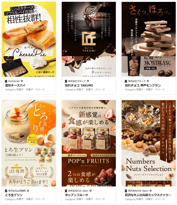 和菓子・洋菓子・スイーツ分野では、ブランドの世界観を大切にしながら、スマホユーザーに伝わりやすいデザインと構成づくりを行っています。限られた画面の中で商品の魅力を最大限に引き出し、ユーザーに「食べてみたい」「贈りたい」と思わせるようなデザインを心掛けています。
