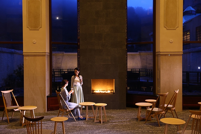 更に奥に進むと、吹き抜けの空間に暖炉がアイコンの、暖炉ラウンジを新設いたしました。