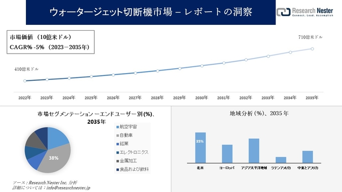 Research Nester の分析調査分析によると、ウォータージェット切断機市場の規模は 2022 年に約 410 億米ドルと記録され、2035 年までに市場の収益は約 710 億米ドルに達すると予測されています。 さらに、市場は予測期間中に最大 5% の CAGR で成長する態勢が整っています。
