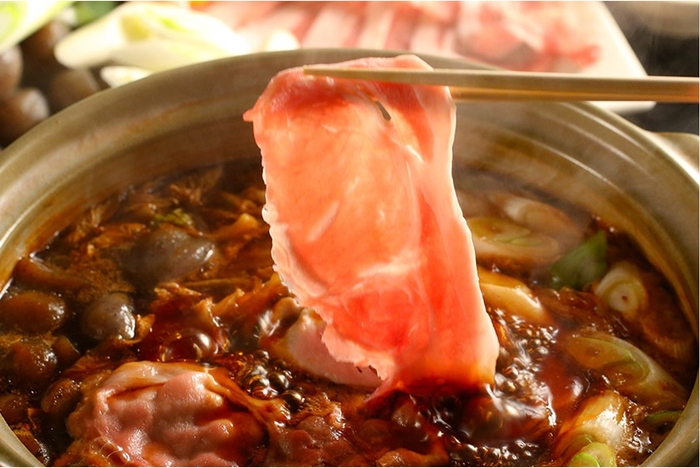「豚すき焼き」は豚肉を甘辛い醤油ベースの出汁で煮込んだ馴染みのある一品。豚肉の旨味が染み込んだ野菜や豆腐まで美味しい、ご飯の進む味付けでお子様にもお薦めです。