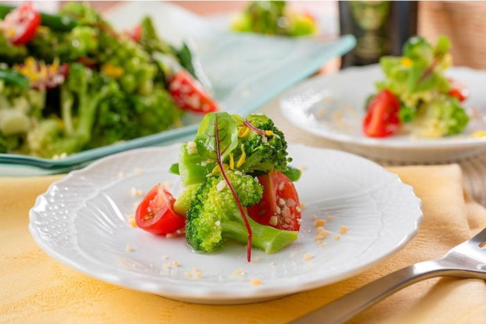 見た目にも春らしい「春野菜の和え物 パルメザン風味」は、一度お浸しにした春野菜をパルメザンチーズ、オリーブオイル、レモン汁で風味付けした爽やかな味わいが魅力。女性にお薦めの一品です。