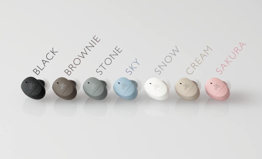 シリーズで好評のCREAM(クリーム)と定番色のBLACK(ブラック)に加え、SAKURA(サクラ)・SNOW(スノー)・SKY(スカイ)・STONE(ストーン)・BROWNIE(ブラウニー)の5色の新しいカラーバリエーションを追加しました。また、皮脂や指紋などの汚れが付きにくいオリジナル表面加工「粉雪塗装」の加工方法を見直し、従来のモデルに比べて、より本体表面に細かな凹凸感を感じられる質感を実現しています。さらに本体や充電ケースは丸みのあるフォルムを採用し、いわゆる「家電製品」のような機械的なデザインではなく、手にしたときに「モノ」としての“柔らかさ”や“ぬくもり”を感じていただけます。