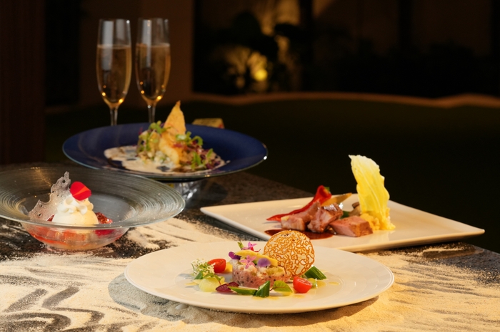 横浜エリアでは珍しい、コース料理とお酒が楽しめるシャンパンガーデンは、ライトアップされたガーデン付きの開放的な空間で、シェフが腕によりをかけた夏を感じる限定コース料理とシャンパンのフリーフロー、マリンカラーのオリジナルカクテルをご堪能いただけます。