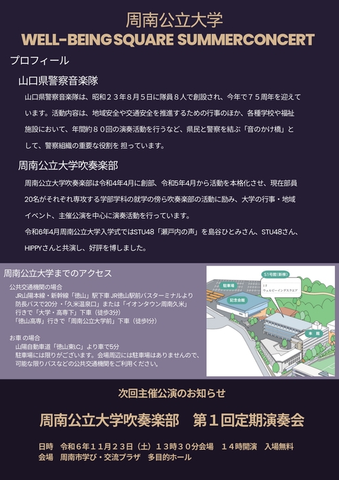 また、7月2日(火)には、地域安全や交通安全を推進するための、県民と警察を結ぶ「音の架け橋」として活動している山口県警察音楽隊がキャンパスコンサートを開催します。