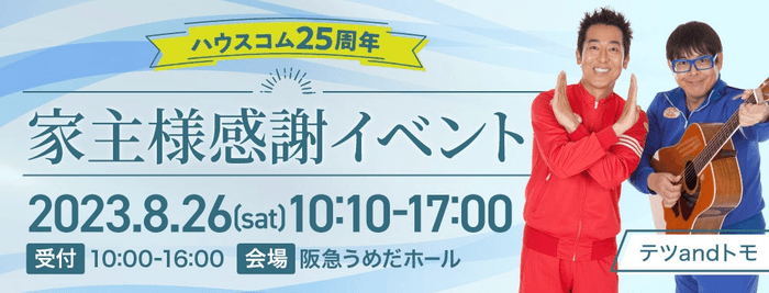 リアル拠点と不動産DXのシナジーでライフスタイルデザインを追求するハウスコム株式会社〔所在地:東京都港区 代表取締役社長執行役員:田村 穂 プライム市場 コード番号:3275、以下ハウスコム〕は、家主との接点強化を目的に「ハウスコム25周年家主様感謝イベント」を8月26日(土)梅田会場にて開催します。