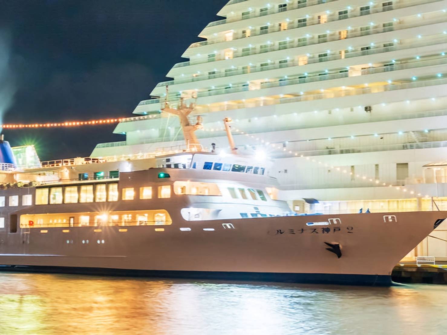 神戸港の海から見るカラフルな夜景と、海に浮かぶ宝石のように輝くレストランクルーズ船。