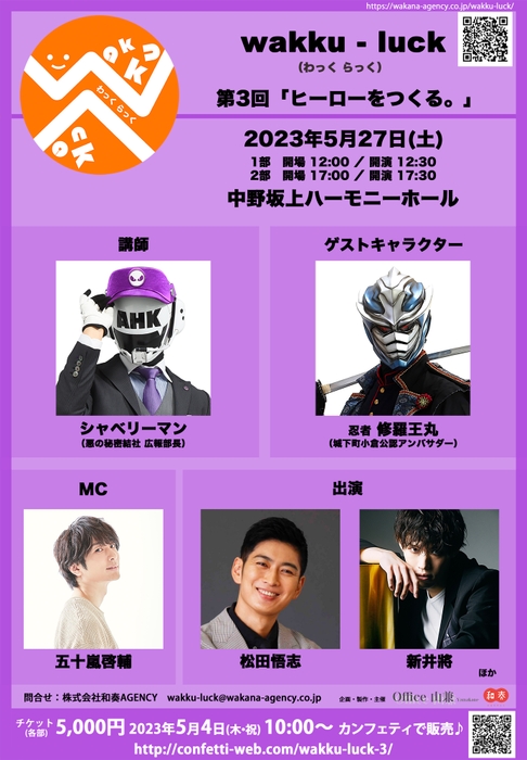 Office⼭兼、株式会社和奏AGENCY 企画・製作・主催、wakku-luck 第3回『ヒーローをつくる。』が2023年5月27日 (土)に中野坂上ハーモニーホール(東京都中野区本町1-32-2)にて開催されます。