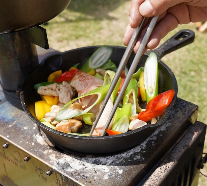 ソロキャンプやデュオキャンプでの調理に最適なミニサイズのフライパン。注ぎ口が両サイドについて利き手関係なく水分が切れます。調理中に溶け出した分で少しずつ鉄分補給ができる優れもの。素材特有の厚みがあり、熱をじっくり均等に伝えてくれます。