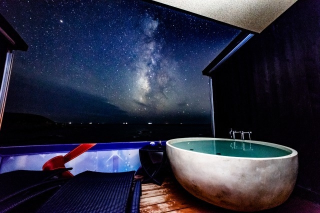 温泉は各予約サイトにおいて全国屈指の高評価を頂いており、当社が開発し既存のXYZPriveteSpa&SeasideResortに設置してます。電動開閉式露天風呂を設置することでサンセット、夜の満点の星空等昼夜問わず広がる海絶景と共にお部屋で楽しむことができます。