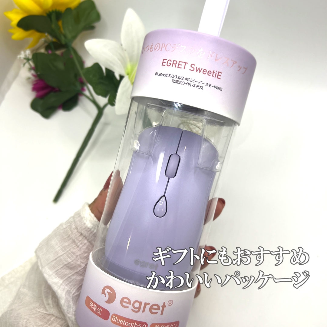 EGRETは本体だけでなく、同梱品やパッケージもおしゃれです。透明の円筒状パッケージはまるでお菓子や化粧品の様、PC作業の多い女子へのプレゼントとして最適です。