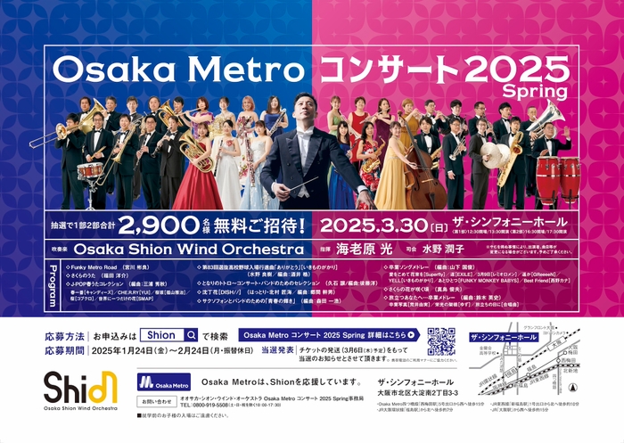 大阪市高速電気軌道株式会社(Osaka Metro)と公益社団法人 大阪市音楽団(Shion)は、2025年3月30日(日曜日)にザ・シンフォニーホールで開催するオオサカ・シオン・ウインド・オーケストラによる「Osaka Metroコンサート2025 Spring」に、抽選で2,900名様を無料でご招待します。