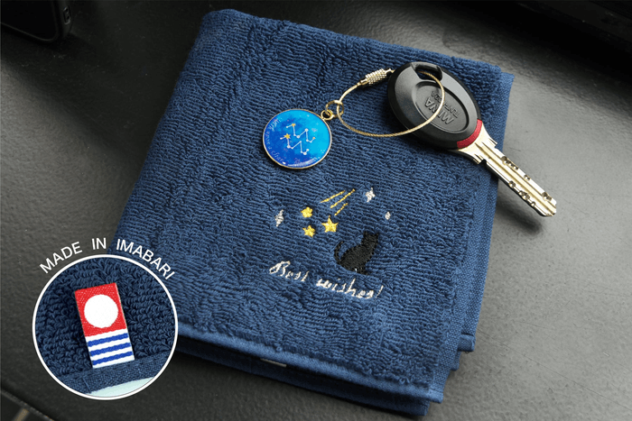 ほどよく厚みのある今治タオルハンカチに、“Best wishes(幸せの訪れを星に願いをこめて)”のメッセージを刺繍しました。手触りも良く吸収性の高い「今治タオルブランド認定マーク」つきです。