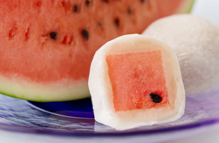 夏の定番フルーツ・スイカを使った「すいか大福」。もっちりふんわりしたお餅にスイカのシャリシャリと涼やかな食感が楽しい大福です。瑞々しい果汁の美味しさ溢れる夏のひと品です。