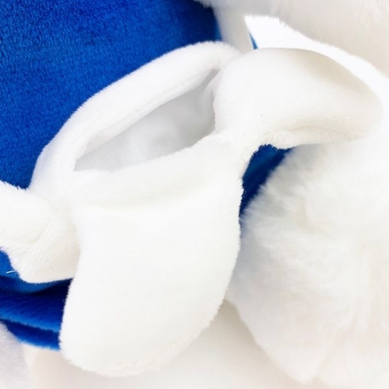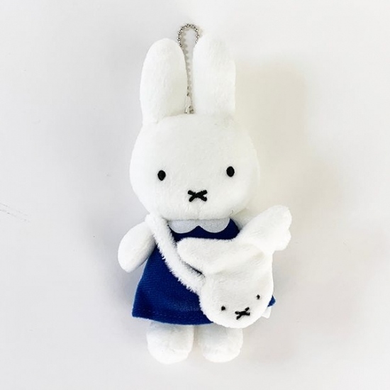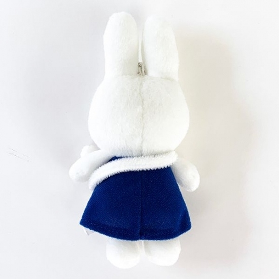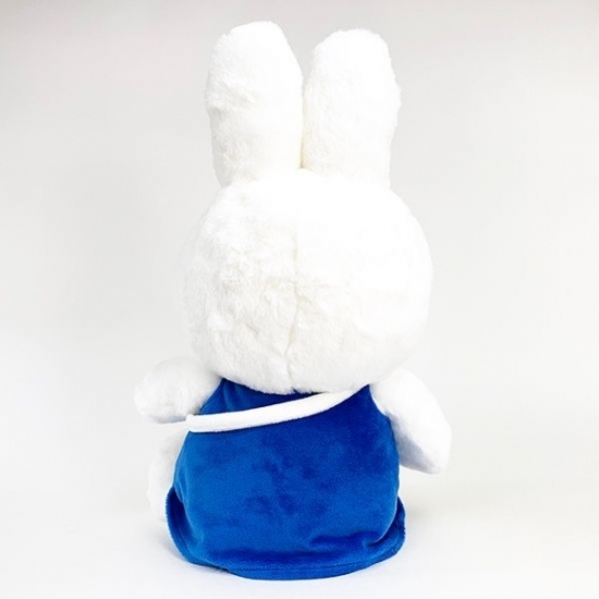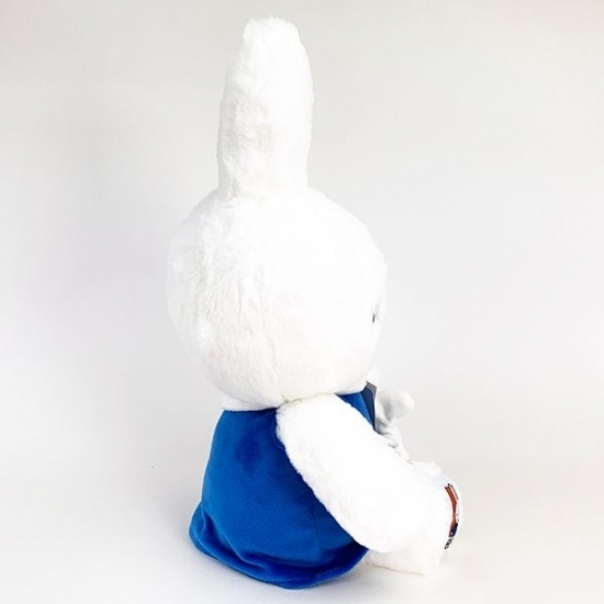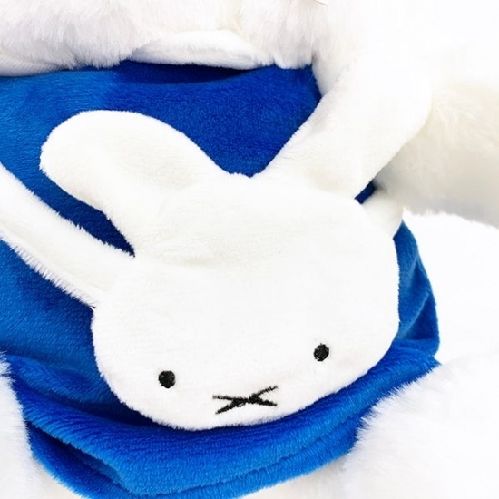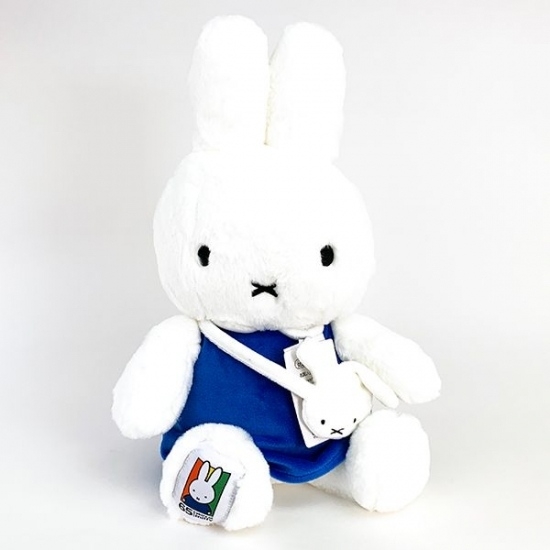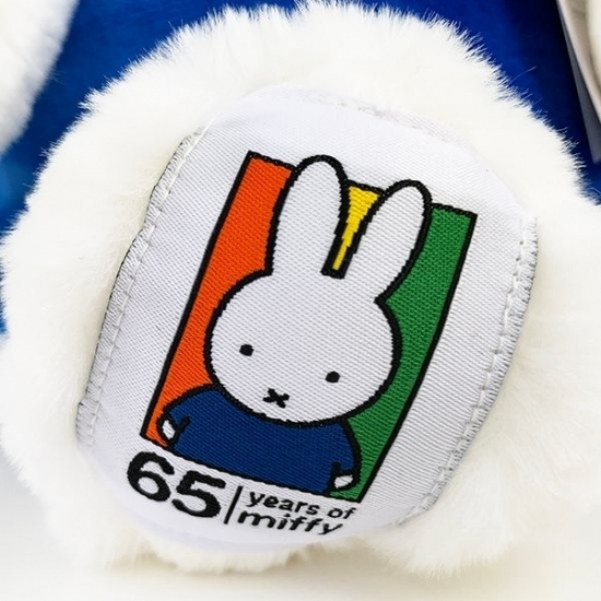 こちらが65周年デザインの、ミッフィーのぬいぐるみです。鮮やかなブルーのお洋服に、ミッフィーのお顔のポシェットまでついていますね、画像だけでも、そのふわふわ感が伝わってきます。