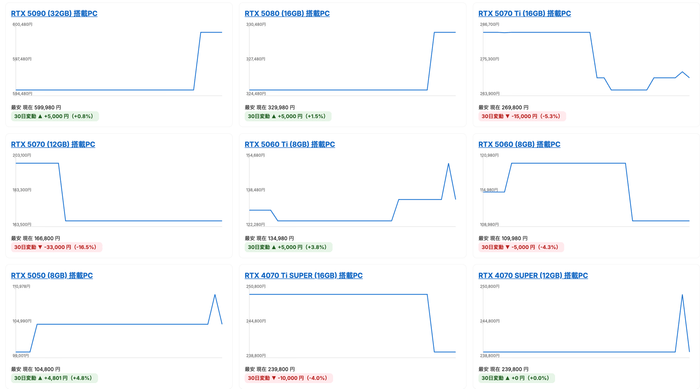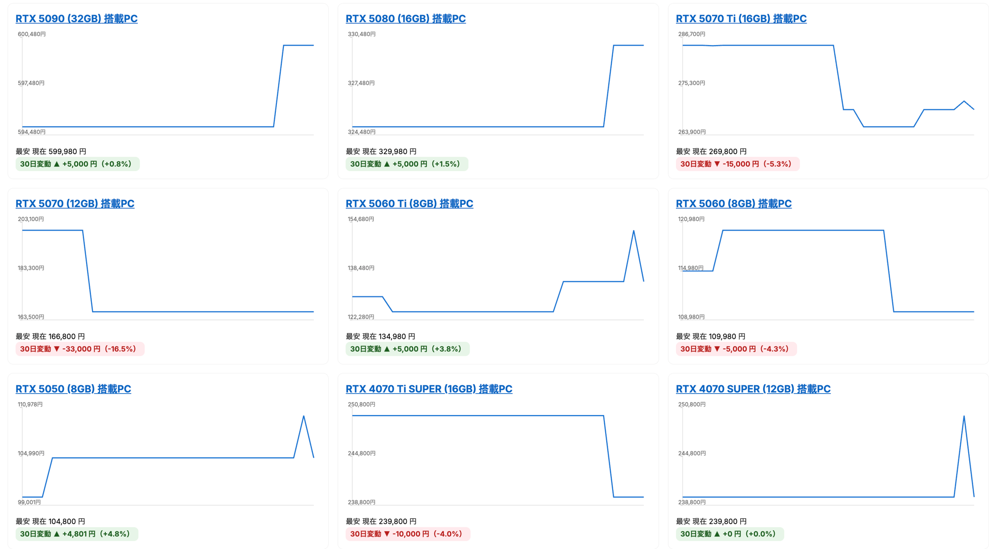 本データは、各メーカー公式サイトに掲載されたBTOモデルを対象に月間の最安値を自動収集したもので、RTX 5090やRTX 5070 Tiなど、最新GPUを搭載したモデルの“実売価格動向”を可視化しています。