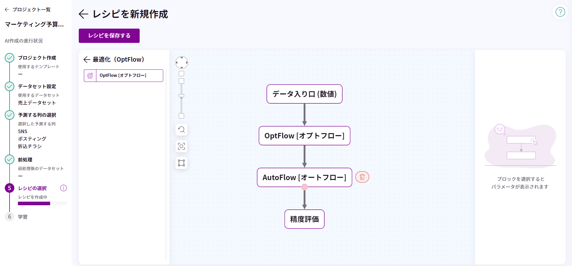 OptFlowの使い方は以下の5ステップです。一切プログラミングすることなく、マウス操作のみでAIに予測させることができます。