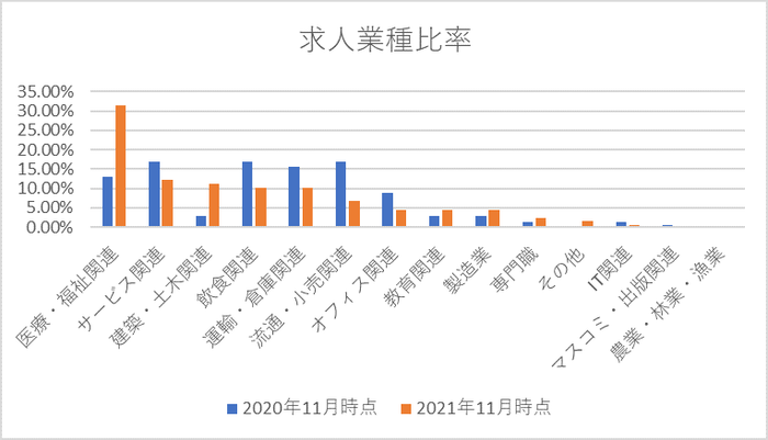 全国的に新型コロナウイルスの感染者が減少傾向にある現在、求人数は増えています。特に2020年と2021年を比較すると(下図参照)医療、福祉関連の求人比率が大幅に伸長していることが特徴です。