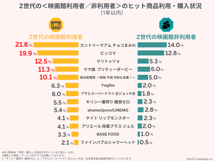 「2021年ヒット商品ベスト30」を参考に、ここ1年以内に利用・購入した商品を調査。<Z世代の映画館利用者>と<Z世代の映画館非利用者>を比較すると、すべての商品・サービスにおいて<Z世代の映画館利用者>の方が利用・購入率が高いことがわかりました。