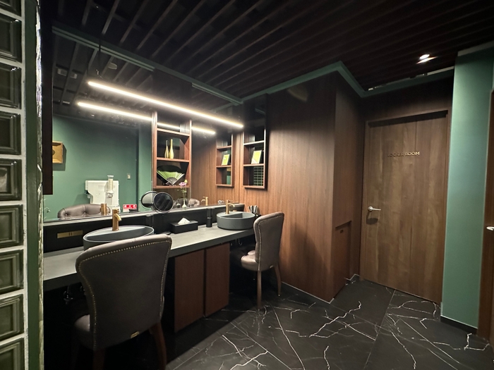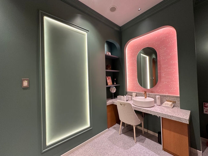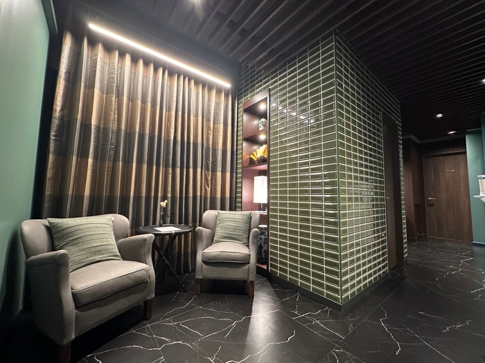 ダンディハウスは、緑色とダークウッドを基調にし、深緑の釉薬タイルが際立つ空間です。また、京都の伝統工芸である唐紙を使用し、歴史や風情を大切にしています。