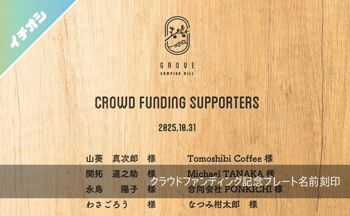 管理棟内の特別な場所に支援者様のお名前を刻み、末永く残します。プロジェクトの一部となって、このキャンプ場の歴史に名を刻むことができます。1名限定特別刻印権: